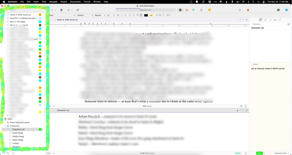This is a list of all the individual documents inside the main file. Yes, with word you get one document split up into different sections based on headings. In Scrivener, I simply click the plus button and make a new page or new document. That one gets nested inside the folder structure — which is the file itself in Scrivener. It sounds really complicated, and a lot of people shudder when they see the layout, but when you’re knee-deep in the weeds and you’re trying to figure how to get your main character back on track, and you look up and realize that in Chapter 7 they should’ve jumped across the creek instead of walking down the road, you can easily grab that chapter with the click of your mouse and move it down to Chapter 15 — or wherever — it makes sense. In Word, that is a tedious, time-consuming process that sometimes leaves the document a bit messy. In Scrivener, all the individual documents can be treated individually from the beginning and only compiled and put together into one document when you’re ready to export the file to a PDF or a book or an EPUB file or whatever…even a <gasp> Word document.