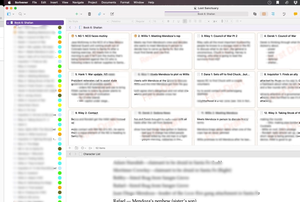 I create a half dozen or so index cards, then title each one with a chapter name, and write a sentence or two about what the chapter is about. That’s it—I don’t put in any details, I just want to lay out where the story is and look at it from a distance like reading a map. Then I can click and drag the chapter index cards into whatever order I want. It’s no different than moving chapter titles around in the binder, but it’s a little more visually satisfying. I’m a visual person, so I like the cards.