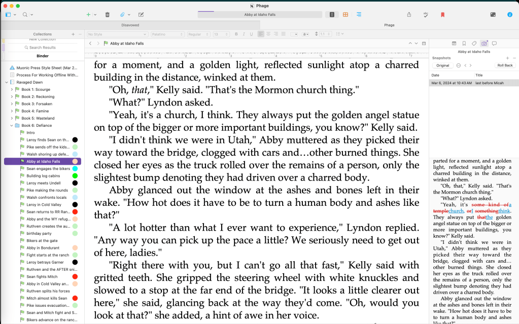 That’s not a big deal for me—and many other authors—because Scrivener will produce a Word file of your story effortlessly. I got into the habit of editing in Word when working with my partner, Mike Kraus on the 18 books we’ve written across three series.[1] Sending the Word file back and forth was far easier than me sending the entire Scrivener package back and forth—since Scrivener files are made up of hundreds of individual RTF files, sending one single Word document was far safer then taking a chance on something causing an issue and jacking up the syncing process.