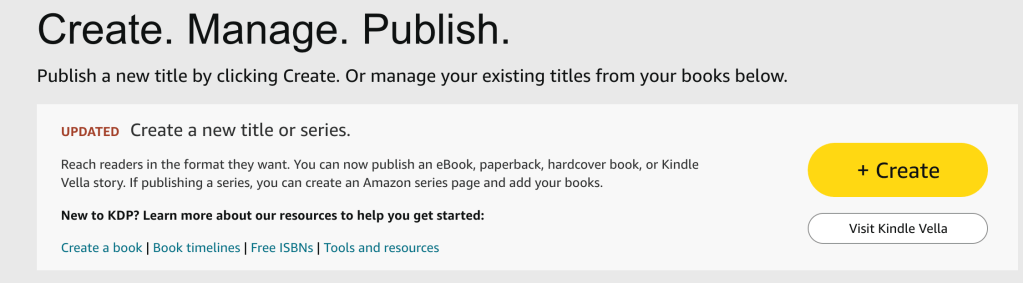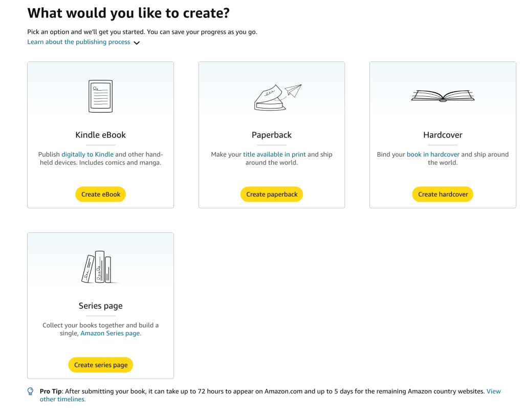 You start (after creating an account) by choosing to create an ebook, a paperback, a hardcover, or a series page. It’s like a choose your own adventure in publsihging.