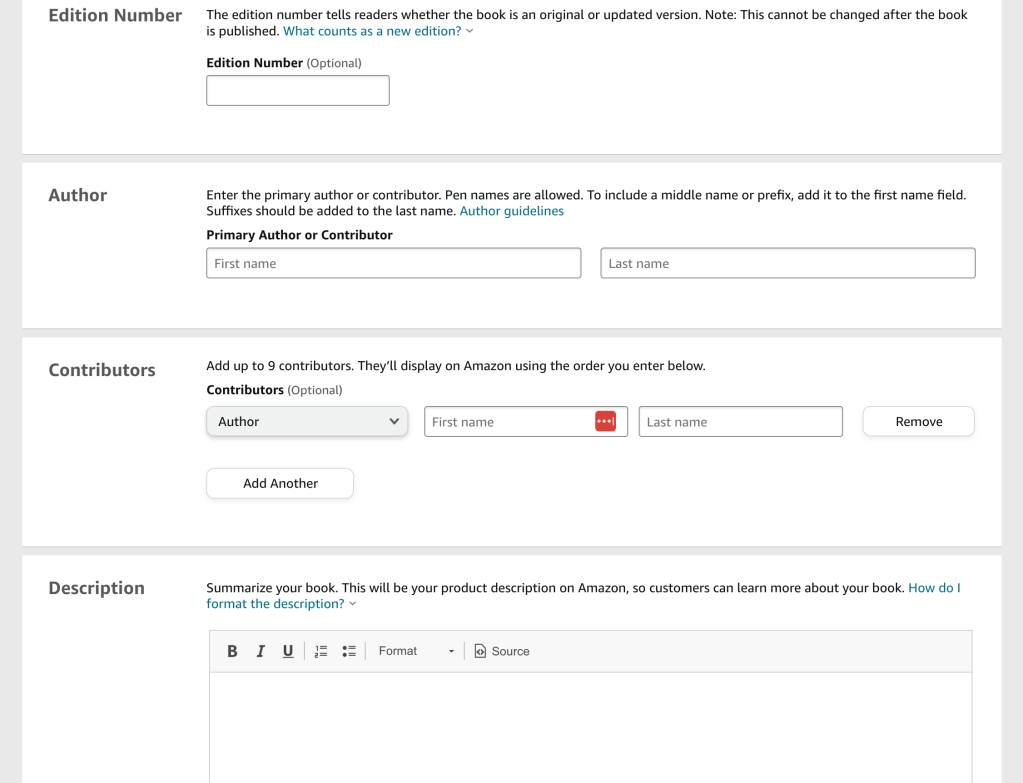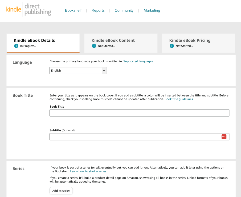 Make your choice, and then it’s on to the questions. In the following pages, you’ll upload your book file and answer a series of questions spread out over several pages about the work: what’s the title, and/or what’s the subtitle? Is it part of a series? If so, what volume number…etc., etc.