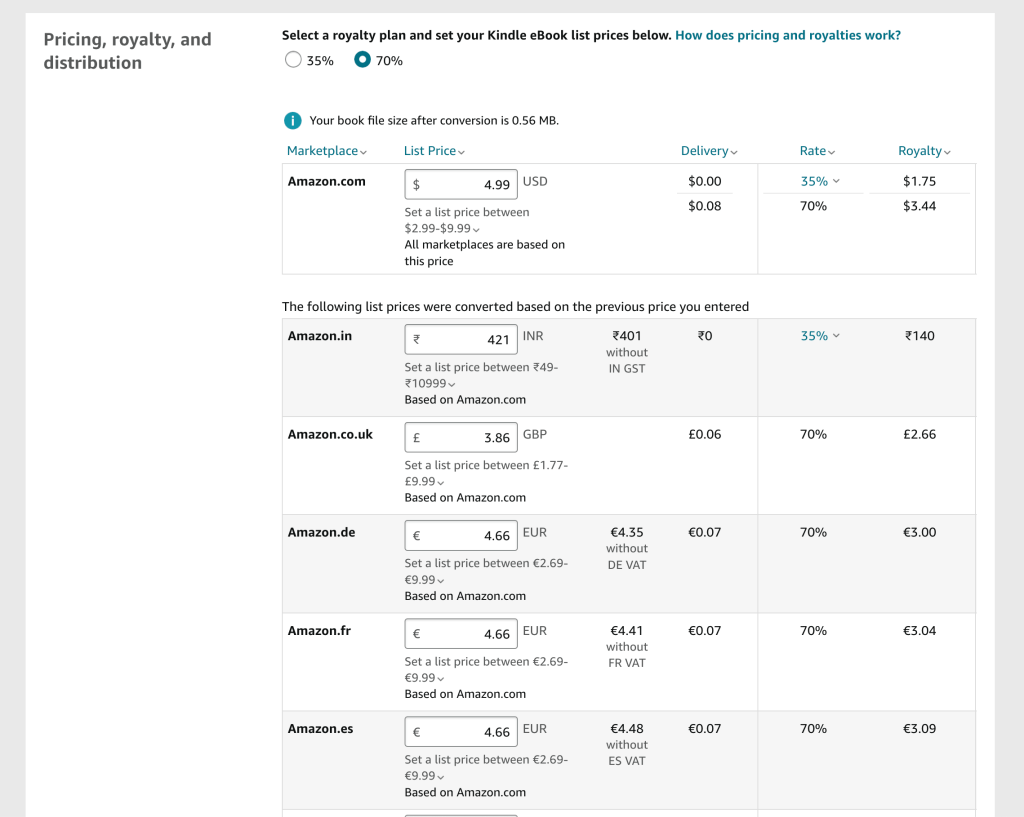There’s even a nifty page in the submission process where you enter a price and Amazon adjusts if for world markets (all the big players do this) so you can see at a glance what you’ll be charging, say, in Canada, France, Mexico, Australia, and the UK vs the US. Most of the other big name players all follow this scheme (more or less).
